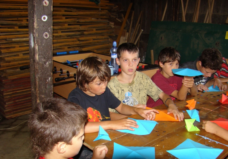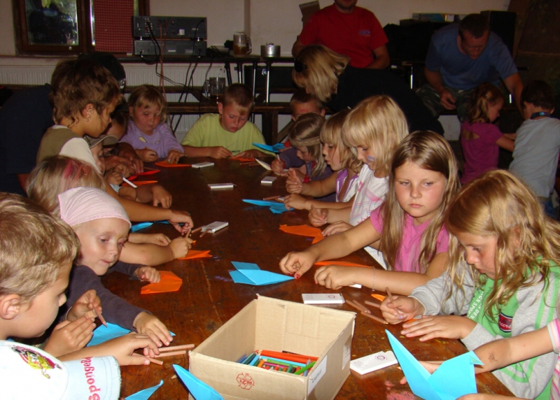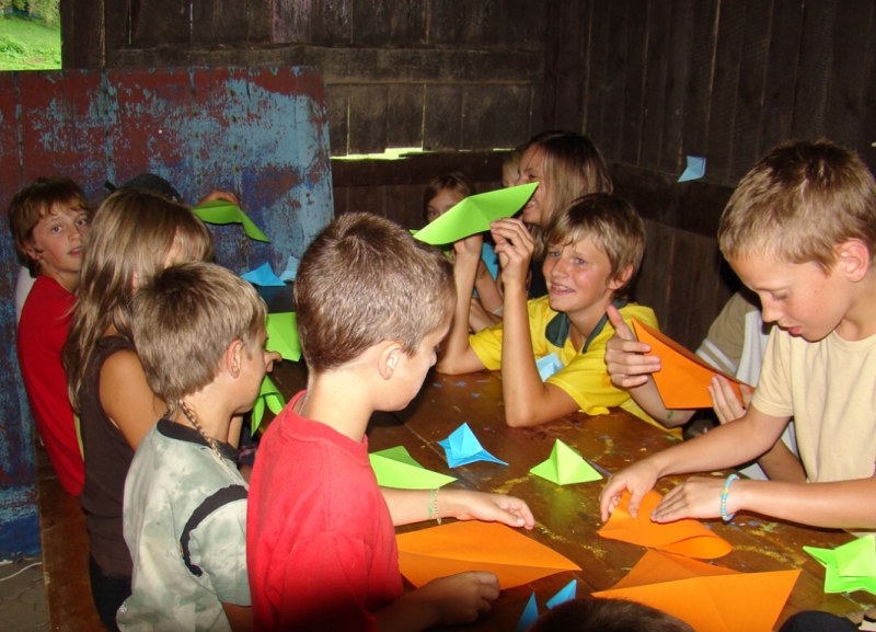 V úterý odpoledne zavítali nadšení muzejníci z Poličky do Pusté Rybné, kde se koná tábor „otcové a děti". Maminkám je vstup zakázán a o své ratolesti se po celý týden starají pouze ostřílení tatínkové. A protože nemohlo více jak sedmdesát dětí zavítat do Centra Bohuslava Martinů na výstavu Papírový svět, vyrazilo muzeum se zásobou barevných papírů za nimi. Skládali malí i velcí. Sami i s pomocí sourozenců si vyráběli papírové květiny, zvířátka, ale i praktické krabičky pro uložení nejrůznějších drobností. Odměnou nám byla nejen radost všech, kteří se tvořivé dílny zúčastnili, ale nakonec i talíř výborných švestkových knedlíků.